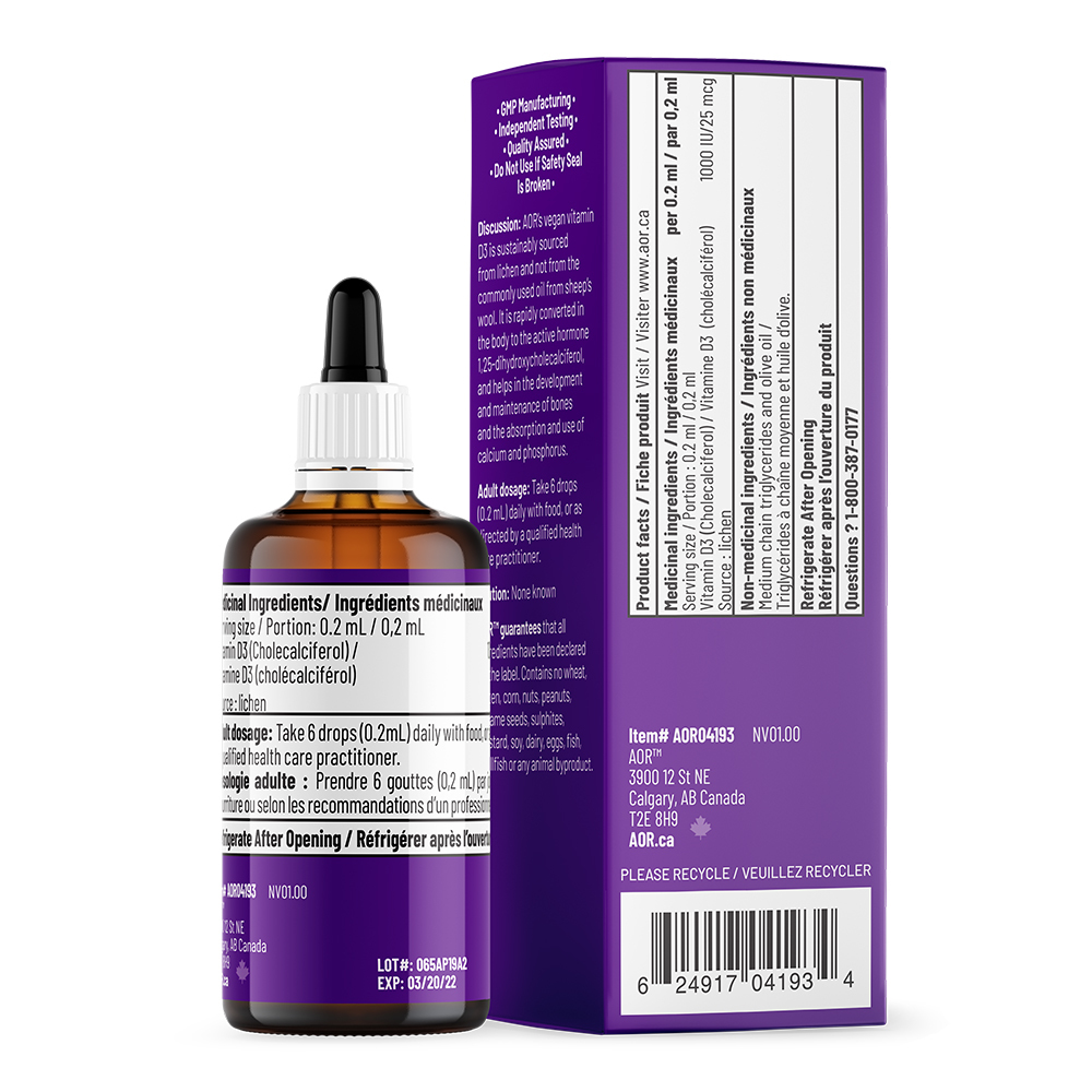 A convenient way to take this important vitamin. AOR Liquid Vitamin D3 is the most absorbable form of vitamin D, with the body being able to easily convert it and utilise it. Vitamin D3 is a form of this vitamin that is rapidly converted in the body ready for use. Although well known for its role in maintaining healthy bones, more recent research has shown that Vitamin D has many more functions in the body. Vitamin D is needed for the normal absorption of calcium and phosphorous and for normal blood levels of calcium. Vitamin D is required for normal maintenance of bones and normal muscle function.